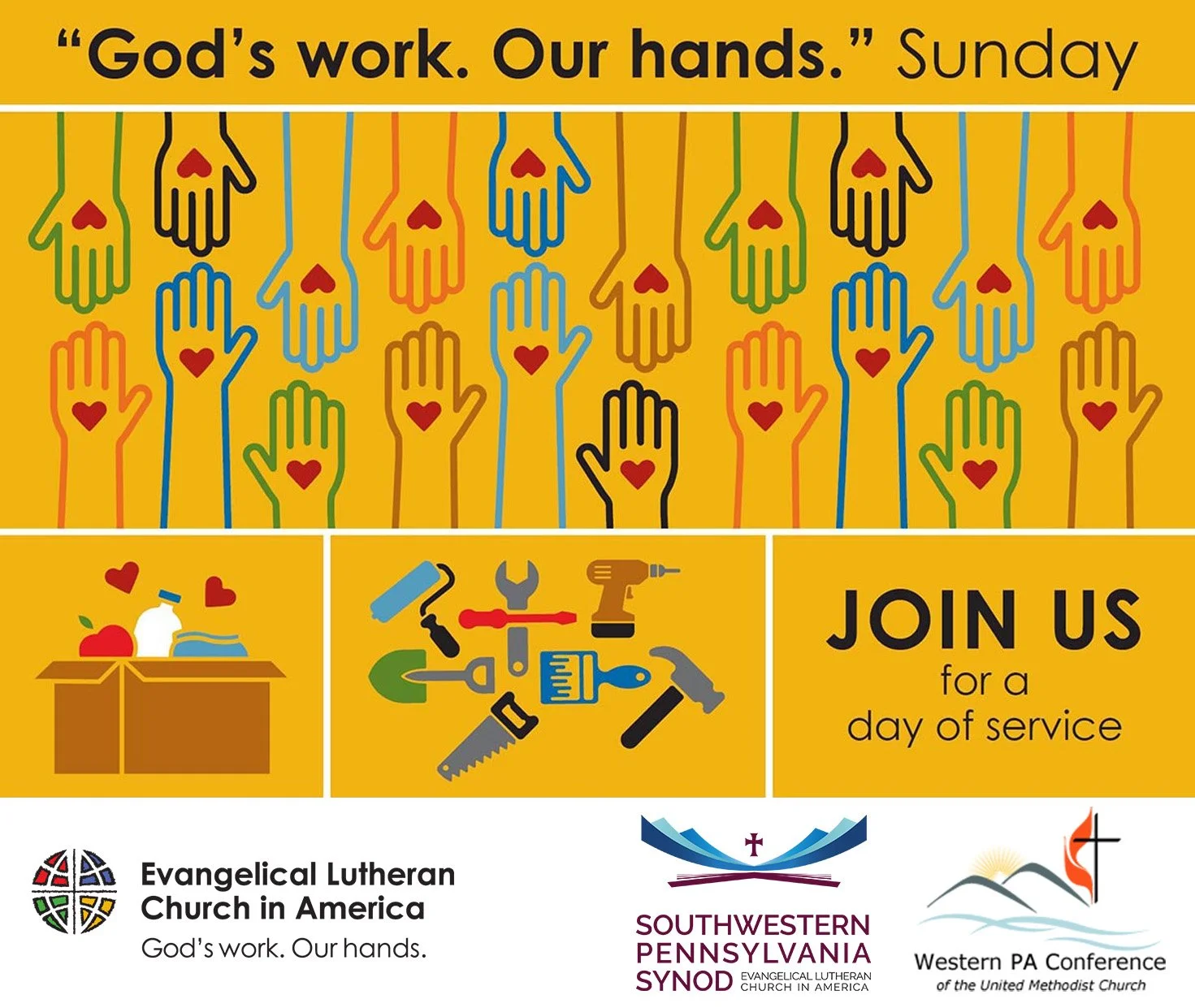 This year, our synod is delighted to partner with the Western PA Conference of the United Methodist Church for “God’s Work. Our Hands.” Sunday! Our congregations are encouraged to get to know their Methodist neighbors, invite them to share in this day of service, and broaden the scope of service projects to nurture these connections.